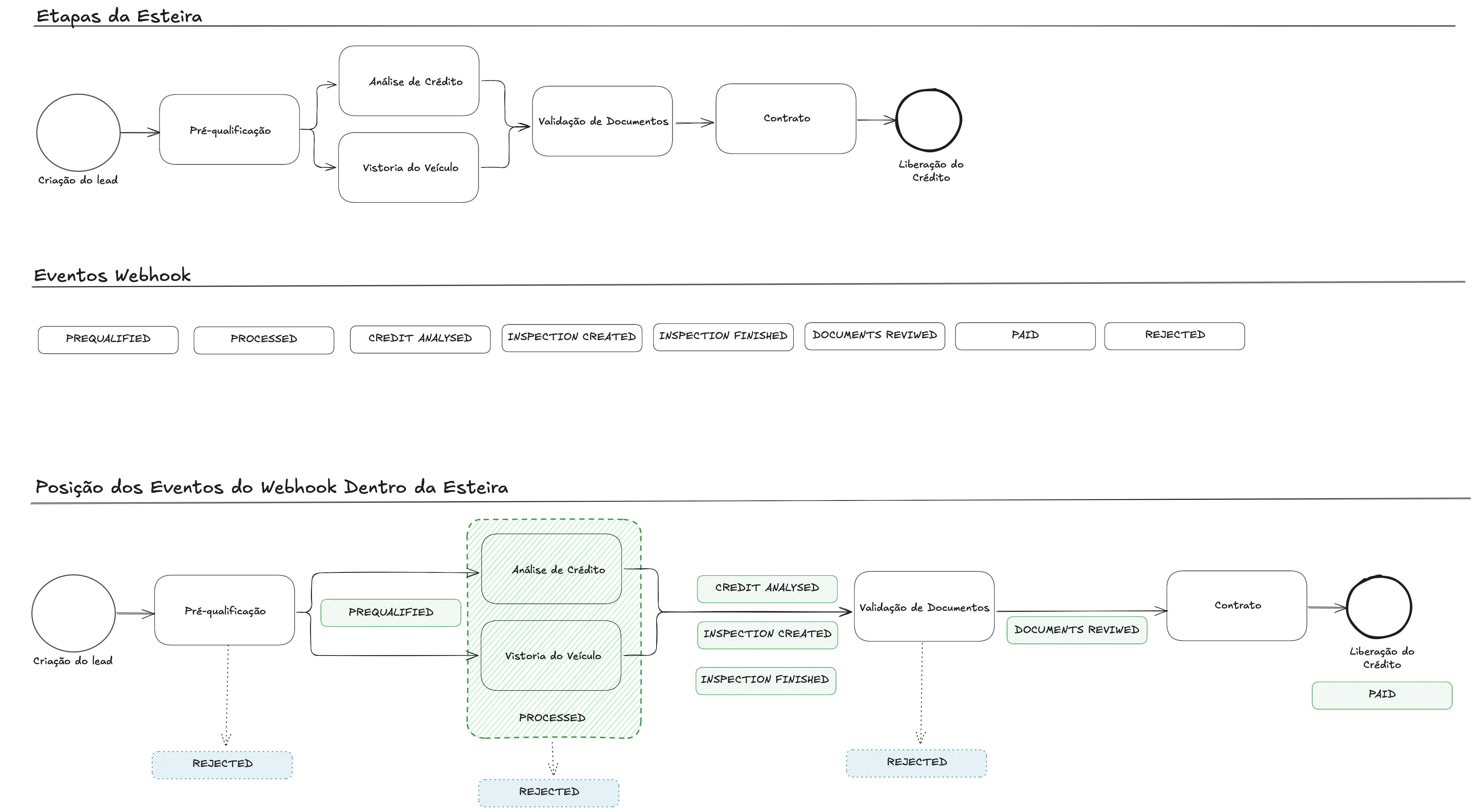 Na imagem abaixo, apresentamos as macro etapas da esteira de Auto Equity, trazemos os eventos disponíveis em nosso webhook e fazemos a contextualização desses eventos na jornada do empréstimo.